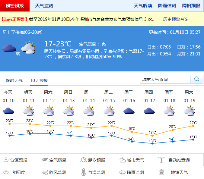 綜合海氣環(huán)流分析和歷史氣候背景,市氣象局預(yù)計深圳的1月將是“氣溫起伏大、階段性陰冷、降雨少而弱”的特點。分別在15-17日、24-25日、1月底至2月初會有冷空氣影響,伴小雨或分散小雨,沿海和高地陣風7-8級,且月內(nèi)最低氣溫10℃以下會有三天左右。而在冷空氣間歇期,則受暖濕南風影響,空氣濕度加大,易出現(xiàn)霧和輕微回南天。未來幾日多云間陰天,陽光增多,早晚有輕霧,天氣溫暖,早晚較濕潤;15日起冷空氣影響,氣溫小幅下降。
