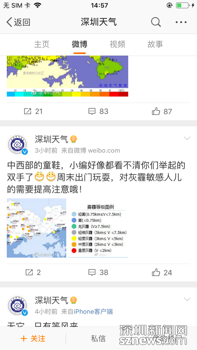1月12日中午,深圳天氣微博發(fā)布預(yù)警,圖中橙色圓點(diǎn)所在的深圳多個(gè)片區(qū)發(fā)生中度灰霾