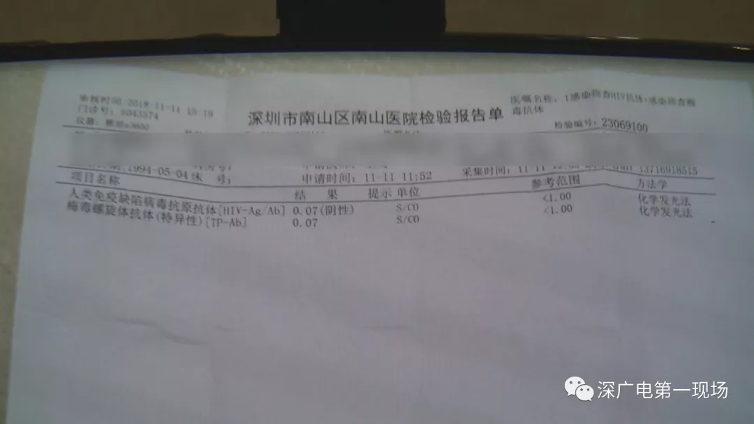 隨后,記者撥打吳某的電話,對(duì)報(bào)料人所說(shuō)的情況進(jìn)行核實(shí)。電話中吳某告訴記者說(shuō)他的病已經(jīng)治好了,并且給記者發(fā)來(lái)一張2018年11月11日,南山醫(yī)院的檢驗(yàn)報(bào)告單。