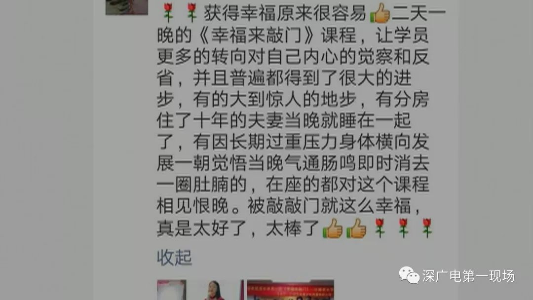 李先生說,價(jià)格雖然有點(diǎn)兒高,但如果能夠讓妻子變好,那也無話可說,然而妻子參加完后面課程回來以后,像是被洗腦了一樣。他偷偷看妻子的微信群,都在談?wù)撜n程有神奇的效果,有人在朋友圈推銷說:聽了課程之后,分房住了十年的夫妻當(dāng)晚就睡在一起。