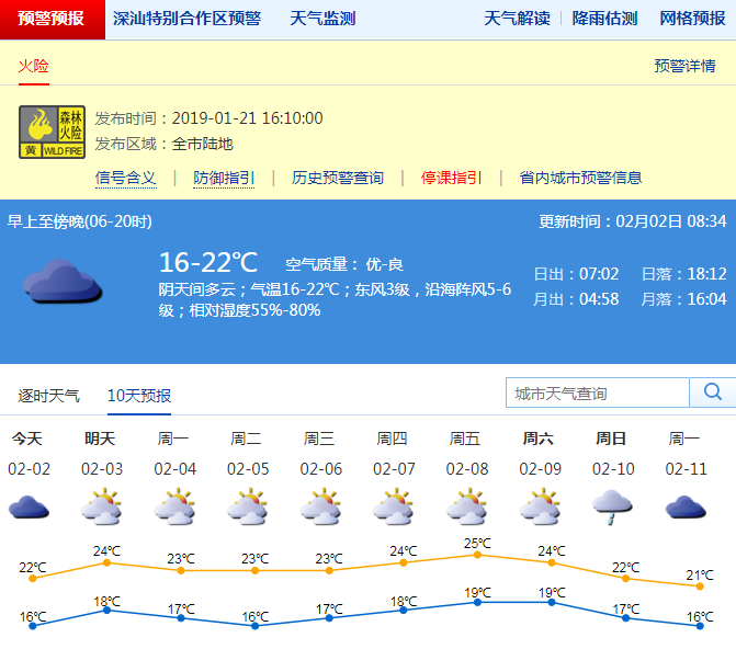 隨著冷空氣的到來,2月1日深圳云量增多,早晨最低氣溫15-17℃,全市能見度普遍在8-20公里,火險預(yù)警信號繼續(xù)生效。
