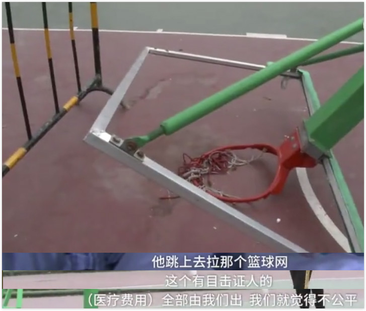 何先生認(rèn)為造成這起事故的主要原因是施工方的疏忽,未將籃球架有效固定,因?yàn)榈顾倪@個(gè)籃球架底座并沒有打鋼釘,填充物也僅有兩塊水泥磚,并不牢固。對(duì)此,球場施工方表示,工程驗(yàn)收時(shí)"百分百 OK",愿意出于人道主義關(guān)懷給予傷者適當(dāng)補(bǔ)償,但拒絕支付全部醫(yī)療費(fèi),因?yàn)椋⑺先ダ莻€(gè)籃球網(wǎng),有目擊者的"。