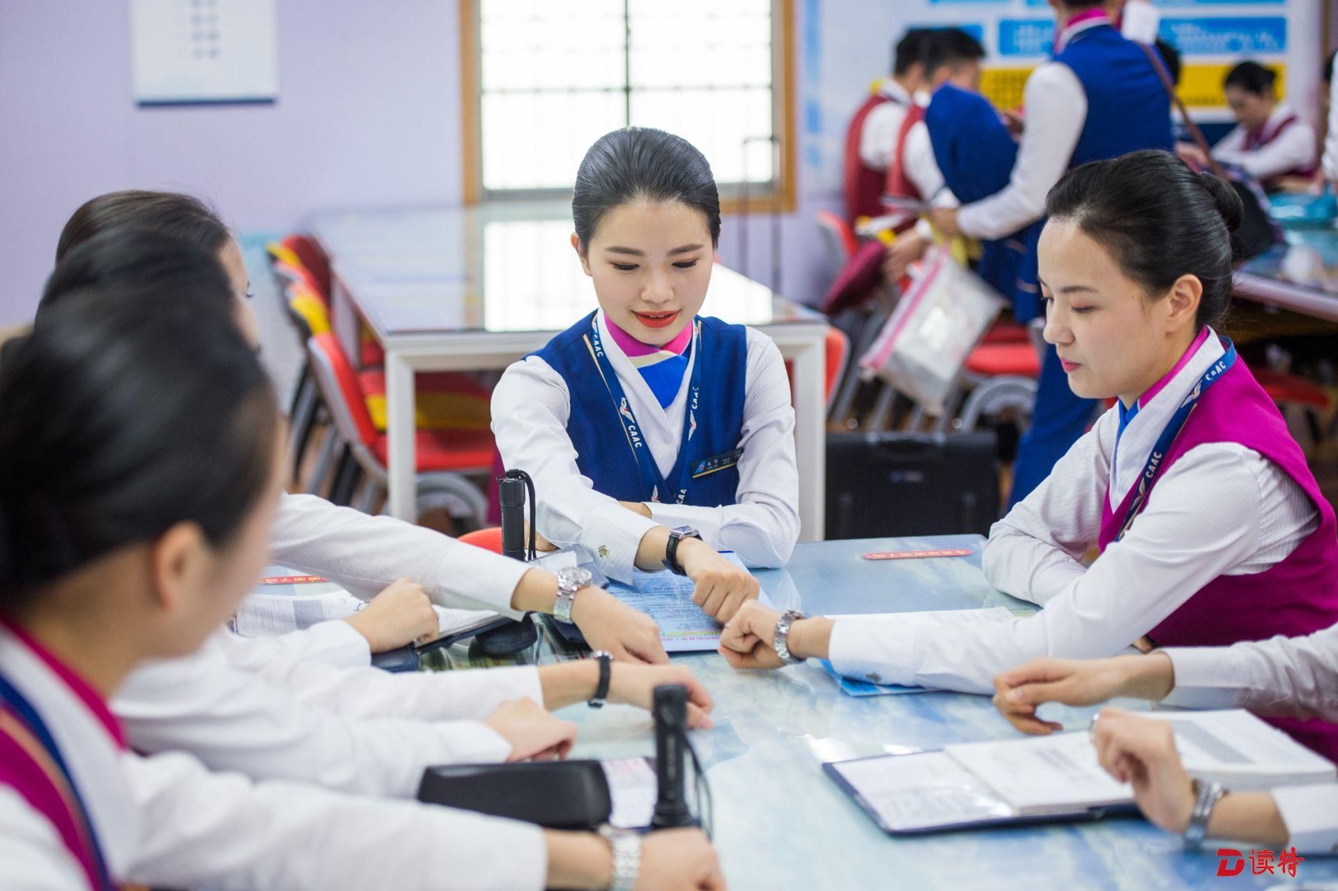 乘務(wù)員們在進行航前準備。