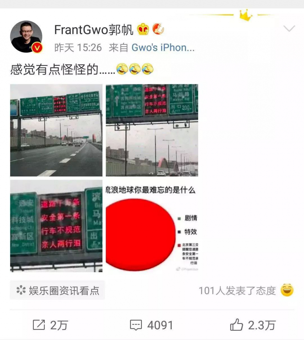 這些現(xiàn)實中的畫面,也把導(dǎo)演"驚動"了,郭帆導(dǎo)演發(fā)微博表示有點怪怪的。