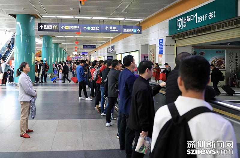 2月13日上午11點(diǎn)左右,深圳火車站內(nèi)人流密集,不少接親友的市民聚集在東出站口前
