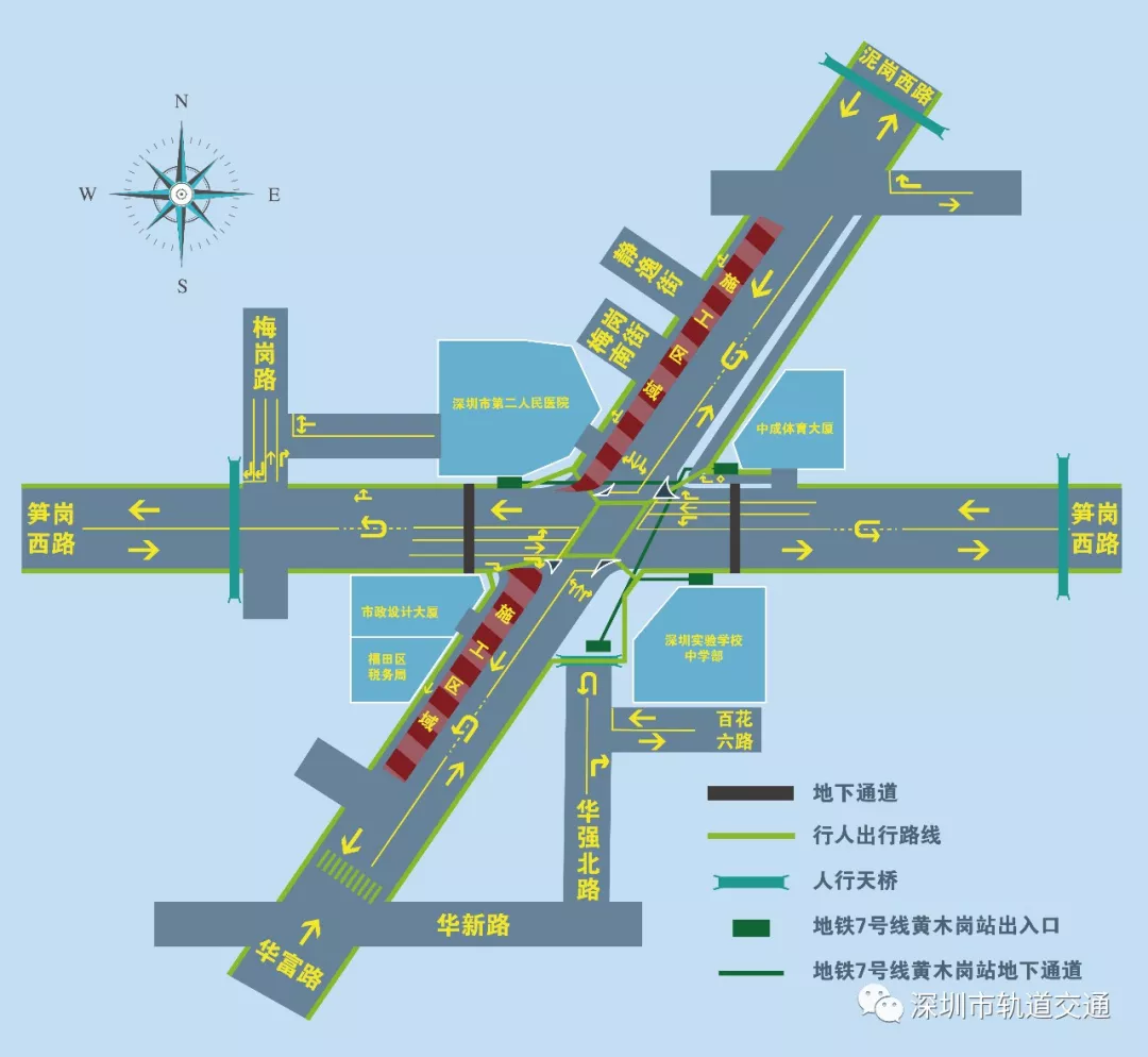 行人可利用平交路口、既有人行天橋、地下通道、地鐵7號(hào)線黃木崗站4個(gè)出入口過街。