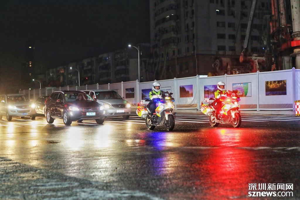 在深圳交警鐵騎帶領(lǐng)下,社會車輛有序通過黃木崗十字路口