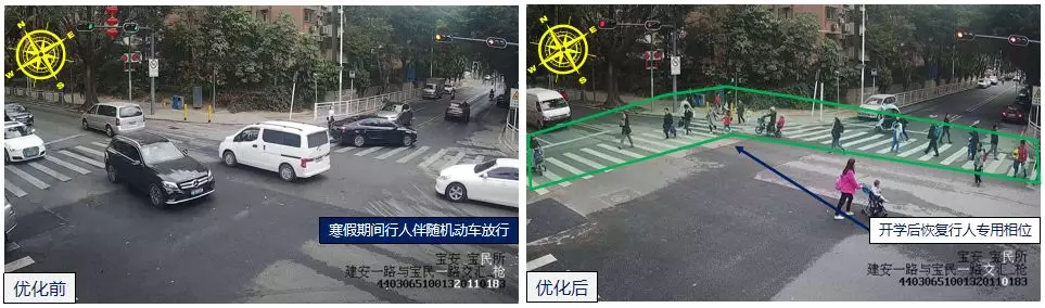 春季開學(xué),清林路/龍?zhí)堵房诘嚷房诨謴?fù)上下學(xué)期間行人專用相位,在學(xué)生過街需求大的時(shí)段,運(yùn)行行人專用相位,分離人、車交織,保障學(xué)生過街安全。