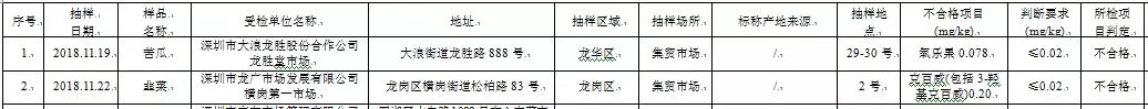 此次監(jiān)測蔬菜63品份,其中2份樣品農(nóng)殘超標,不合格樣品抽樣位點是:龍華區(qū)大浪街道龍勝路888號龍勝堂市場29-30號檔和龍崗區(qū)橫崗街道橫崗第一市場2號檔。