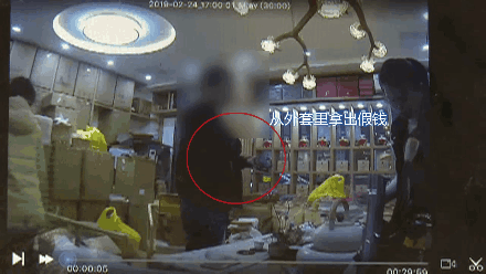秦女士告訴記者,其實(shí)此時(shí)錢已經(jīng)被掉包了。從監(jiān)控視頻中可以發(fā)現(xiàn),這位顧客在秦女士去冰柜拿茶葉,小娟在檢查第一張100元時(shí),疑似從外套里拿出了一張假幣壓在了錢包底下。
