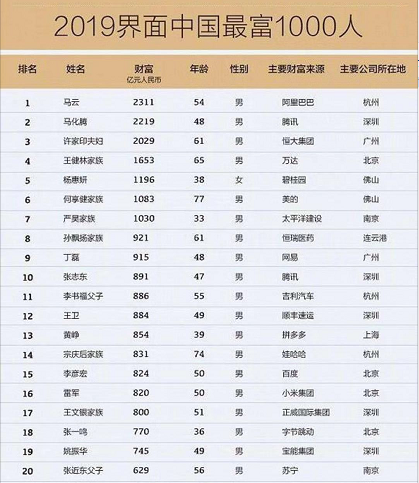 界面發(fā)布2019中國最富1000人榜:馬云問鼎中國首富馬化騰緊隨其后