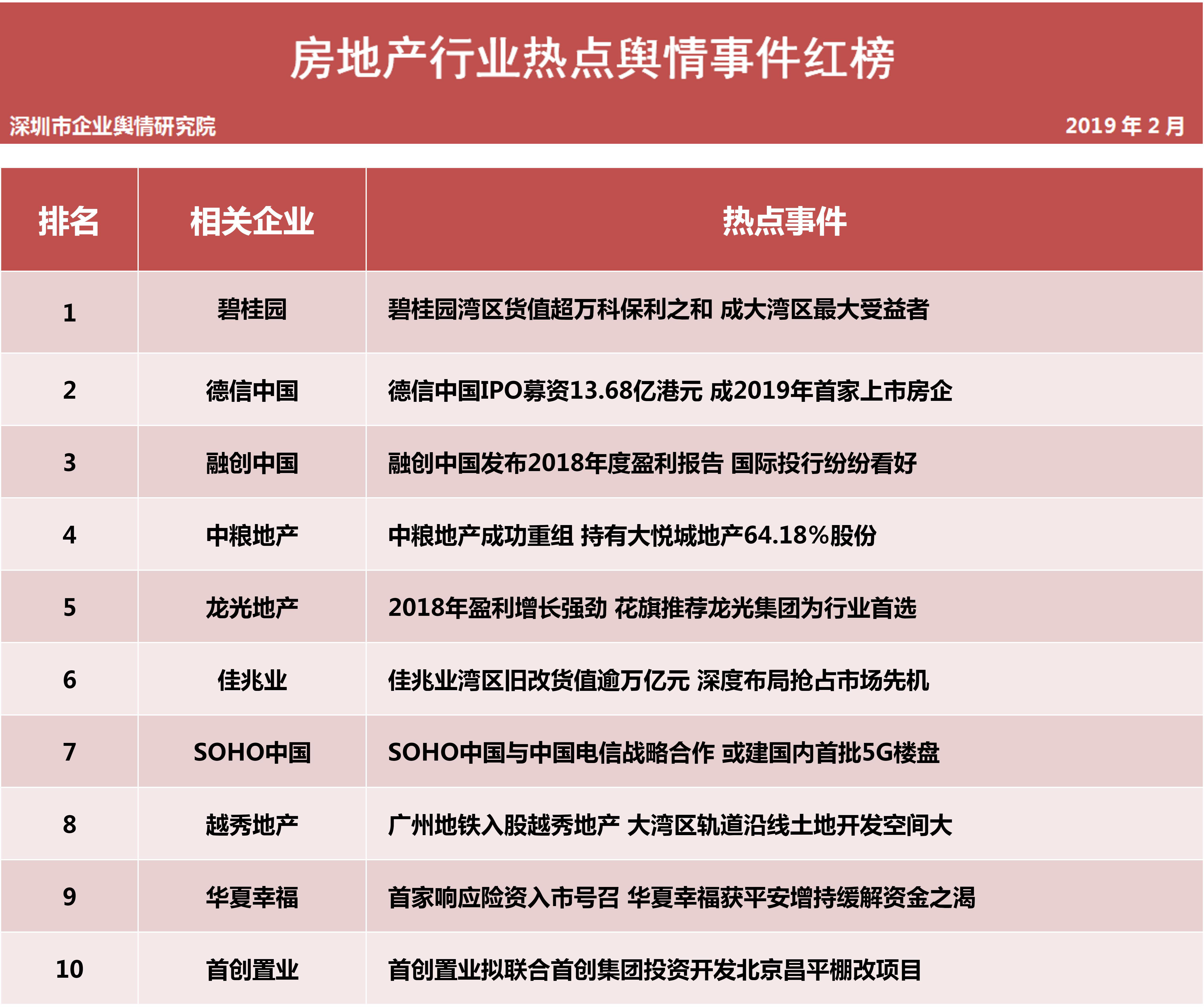 深圳新聞網(wǎng)2019年3月5日訊 (記者田志強 通訊員陳文光)3月5日,深圳企業(yè)輿情研究院發(fā)布第十三批企業(yè)輿情榜單。本次榜單重點聚焦房地產(chǎn)及醫(yī)藥保健兩個行業(yè)。房地產(chǎn)行業(yè)企業(yè)輿情榜單由房地產(chǎn)行業(yè)熱點輿情事件排行榜(紅、黑榜)及房地產(chǎn)企業(yè)公眾形象排行榜組成。