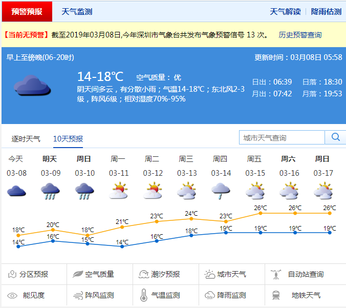 據(jù)深圳市氣象臺最新的預測,今天到3月10日,深圳每天都有間歇性的短時強降水,期間可能出現(xiàn)8級短時大風、短時強降水和雷暴,日雨量局地可達暴雨量級,主要降雨時段在7日夜間至8日上午和9日夜間至10日中午;10日午后降雨減弱。