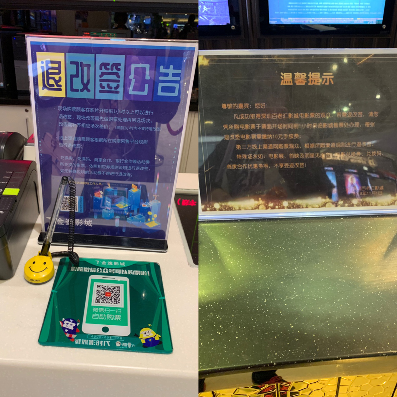 線上支持“退改簽”的影院不多,那么線下電影院“退改簽”的情況怎么樣?記者昨日到福田中心城的多家影院了解情況。“在我們前臺購買的電影票,在影片開映前1小時以上可進行退改簽,但如果是在線上的售票渠道購買的電影票,我們不支持退改簽?!苯鹨萦俺侵行某堑赇N售員說。記者走訪發(fā)現(xiàn),福田多家影院的售票處均有“退改簽”的公告,注明不同購票渠道的不同退改簽流程,以及退改簽的時間和費用。