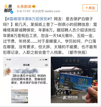 親,找工作嗎?聽(tīng)說(shuō)雷峰塔年薪8萬(wàn)招保安