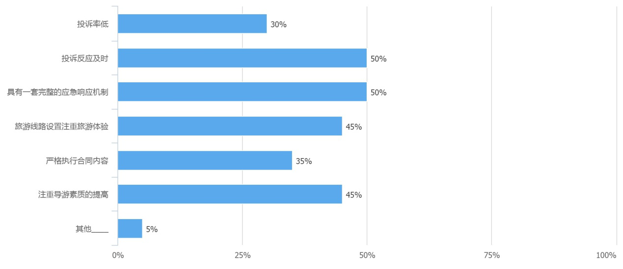 在眾多的旅游體驗(yàn)當(dāng)中,消費(fèi)者遇到的最主要的問(wèn)題是強(qiáng)制購(gòu)物、遭遇虛假宣傳、臨時(shí)更改旅游線路等問(wèn)題,同時(shí)消費(fèi)者在選擇旅游線路時(shí),“野馬旅行社”、導(dǎo)游的服務(wù)態(tài)度、安全等問(wèn)題也在重點(diǎn)考慮范圍內(nèi)。在改進(jìn)旅行社服務(wù)質(zhì)量方面,80%的消費(fèi)者認(rèn)為現(xiàn)狀需要政府和網(wǎng)絡(luò)共同關(guān)注,才能營(yíng)造良好的旅游環(huán)境。旅行社對(duì)于投訴案例的反應(yīng)機(jī)制和反應(yīng)速度,之后也將成為消費(fèi)者在選擇旅行線路時(shí)的重要考量標(biāo)準(zhǔn)之一。