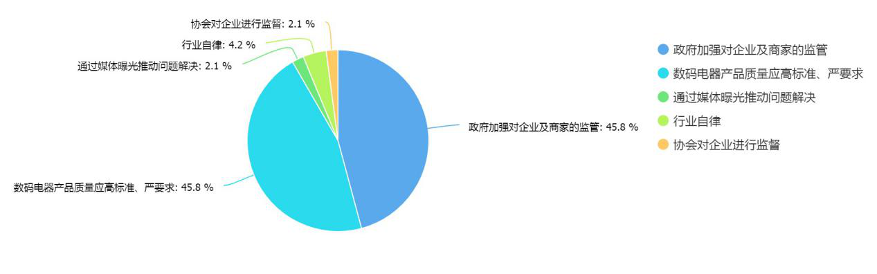 針對(duì)目前數(shù)碼家電行業(yè)中存在的相關(guān)問(wèn)題,有45.8%的消費(fèi)者建議通過(guò)政府加強(qiáng)對(duì)企業(yè)及商家的監(jiān)管,另有部分網(wǎng)民建議數(shù)碼家電類產(chǎn)品應(yīng)該設(shè)立更高的的標(biāo)準(zhǔn),對(duì)企業(yè)應(yīng)該提出更高的要求。