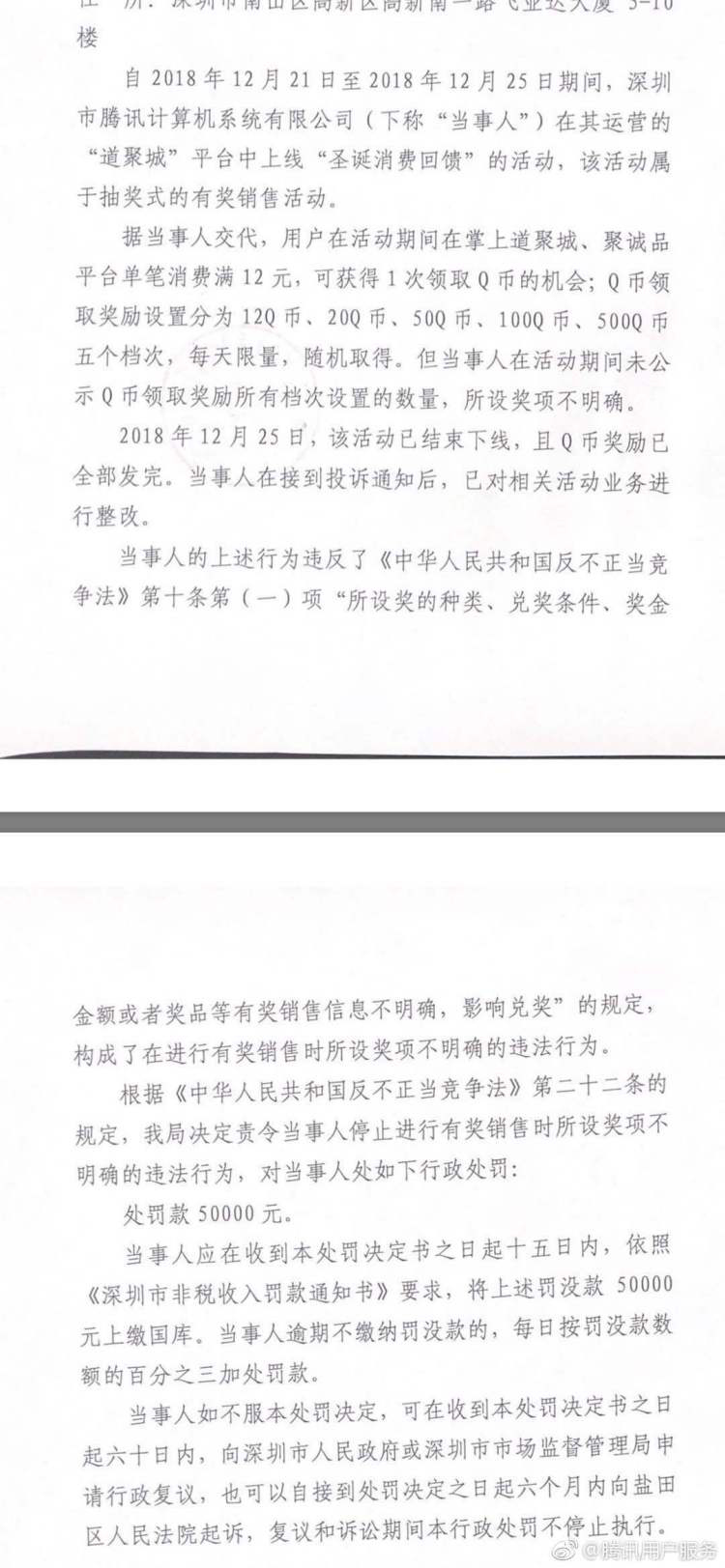 為解答網(wǎng)友疑惑,當(dāng)天晚間,微博賬號(hào)騰訊用戶服務(wù)公開(kāi)發(fā)布了該處罰決定書(shū),決定書(shū)中提到,2018年12月21日 -25日期間,深圳市騰訊計(jì)算機(jī)系統(tǒng)有限公司(下稱"當(dāng)事人")在其運(yùn)營(yíng)的"道聚城"平臺(tái)中上線"圣誕消費(fèi)回饋"的活動(dòng),該活動(dòng)屬于抽獎(jiǎng)式的有獎(jiǎng)銷售活動(dòng)。