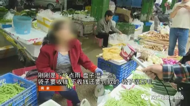 記者跟隨執(zhí)法人員首先來到購買了茄子的攤位,這位商家開始辯稱自己的秤是被雨水給打濕了,并且表示在和記者收錢過程中,加收了塑膠袋的錢。