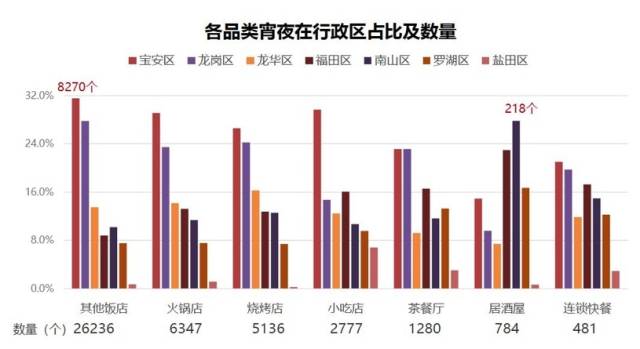 各品類宵夜在7個行政區(qū)占比及數(shù)量