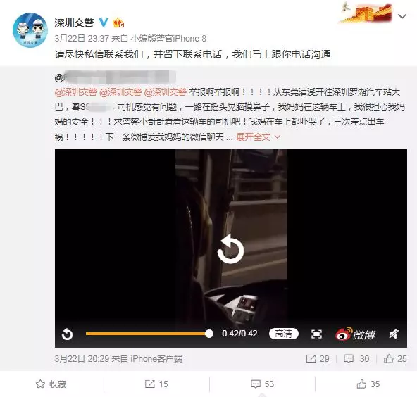 “舉報啊舉報?。。?!大巴車三次差點出車禍!司機一路搖頭晃腦摸鼻子!?。?!”3月22日晚,深圳交警在微博上接到網(wǎng)友舉報。