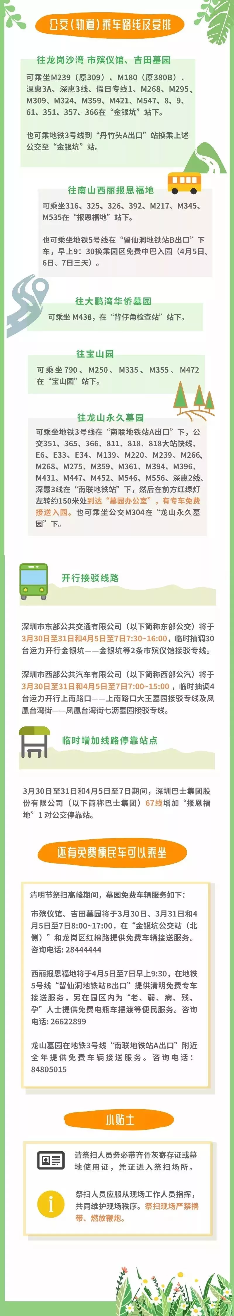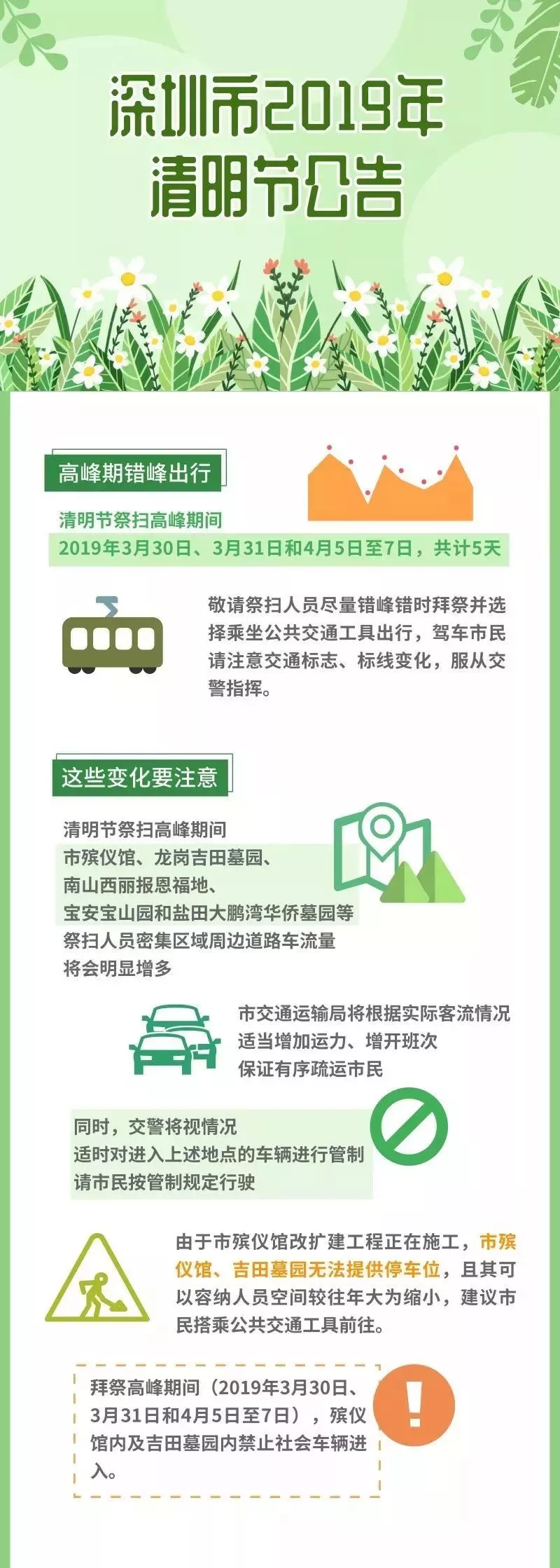 交警部門將視情況對(duì)上述地點(diǎn)進(jìn)行交通管制,為滿足市民朋友出行祭掃需要,除了給大家準(zhǔn)備出行指引外還將開行墓園接駁專線、增加停靠站、增加運(yùn)力請(qǐng)大家文明出行、綠色出行。