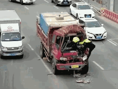 滾滾車流中,一輛車頭被撞凹的貨車,兩個爬上車頭的鐵騎,這是在做什么?