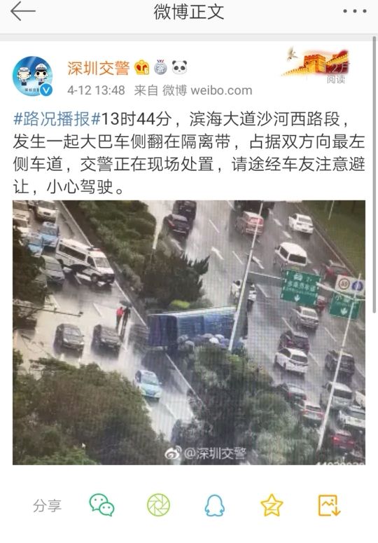 深圳交警通過微博發(fā)布消息,提醒沿途司機注意避讓,小心行駛。