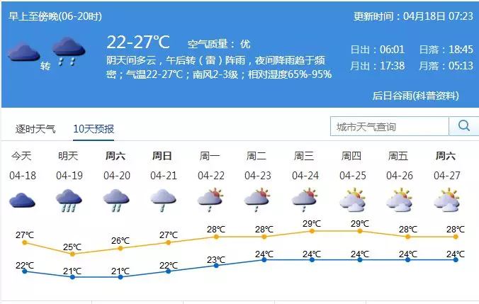 據(jù)深圳天氣,18-20日深圳將迎來新一輪暴雨過程:18日陰天轉小到中雨局部大雨伴有短時雷暴,氣溫22-27℃,19-20日有中到大雨局部暴雨并伴有雷暴和短時大風;21日降雨減弱;22-23日有短時陣雨,部分時間可見陽光。