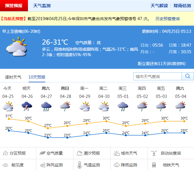 深圳新聞網(wǎng)2019年4月25日訊 本周以來,陽光充足,氣溫逐日上升,不過隨著“五一”假期的臨近,強(qiáng)降雨也在悄悄靠近。據(jù)市氣象臺(tái)預(yù)測,25日我市多云,中午前后炎熱,有短時(shí)陣雨或雷陣雨,早晚東部有大霧。26-27日有大雨到暴雨,伴短時(shí)強(qiáng)降水、8級(jí)左右短時(shí)大風(fēng)和雷暴。28-30日降雨減弱,有陣雨或雷陣雨;展望“五一”假期前期還有一次強(qiáng)降雨過程。
