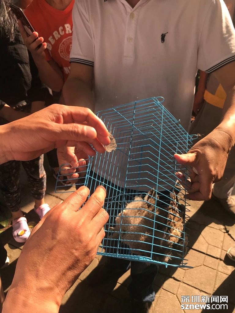 小區(qū)保安先把小貓頭鷹裝進籠子,等待動保所的工作人員到來。深圳新聞網記者 施翔東 攝