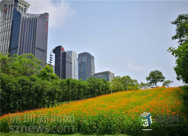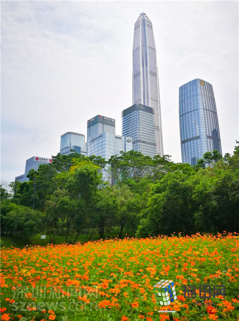 遠(yuǎn)處的平安大廈,近處的綠樹(shù)、花海,構(gòu)成了一副靜謐美好的畫(huà)面。