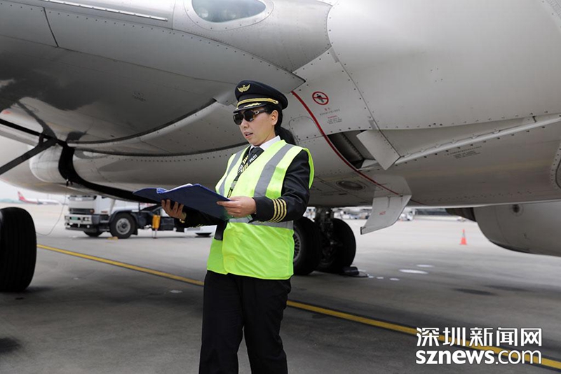 上午8時,航班起飛前,飛行員崔陽按程序開展航前飛機(jī)檢查工作(涂勝 攝)