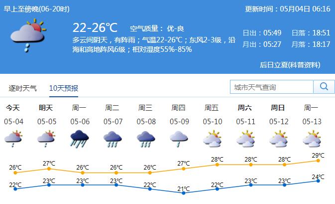 4日我市多云,可見陽光,局部有短時(shí)陣雨,氣溫21-26℃,中午前后體感微熱。