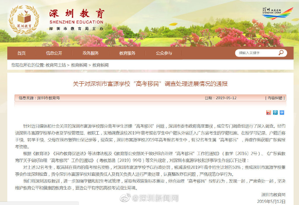 針對(duì)近日媒體和社會(huì)關(guān)注的深圳市富源學(xué)校部分高考學(xué)生涉嫌“高考移民”問(wèn)題,深圳市委市政府高度重視,成立專(zhuān)門(mén)調(diào)查組進(jìn)行了深入調(diào)查。經(jīng)約談深圳市富源學(xué)校舉辦者及學(xué)校管理層、教職工,實(shí)地調(diào)查該校2019年高考報(bào)名學(xué)生中戶籍從外省遷入廣東省考生的學(xué)籍檔案、在校學(xué)習(xí)記錄、戶籍遷移手續(xù)、轉(zhuǎn)學(xué)手續(xù)、父母在我市繳納社保記錄等,現(xiàn)查實(shí),深圳市富源學(xué)校2019年高考報(bào)名考生中,有32名考生屬“高考移民”,弄虛作假獲取廣東省報(bào)考資格。