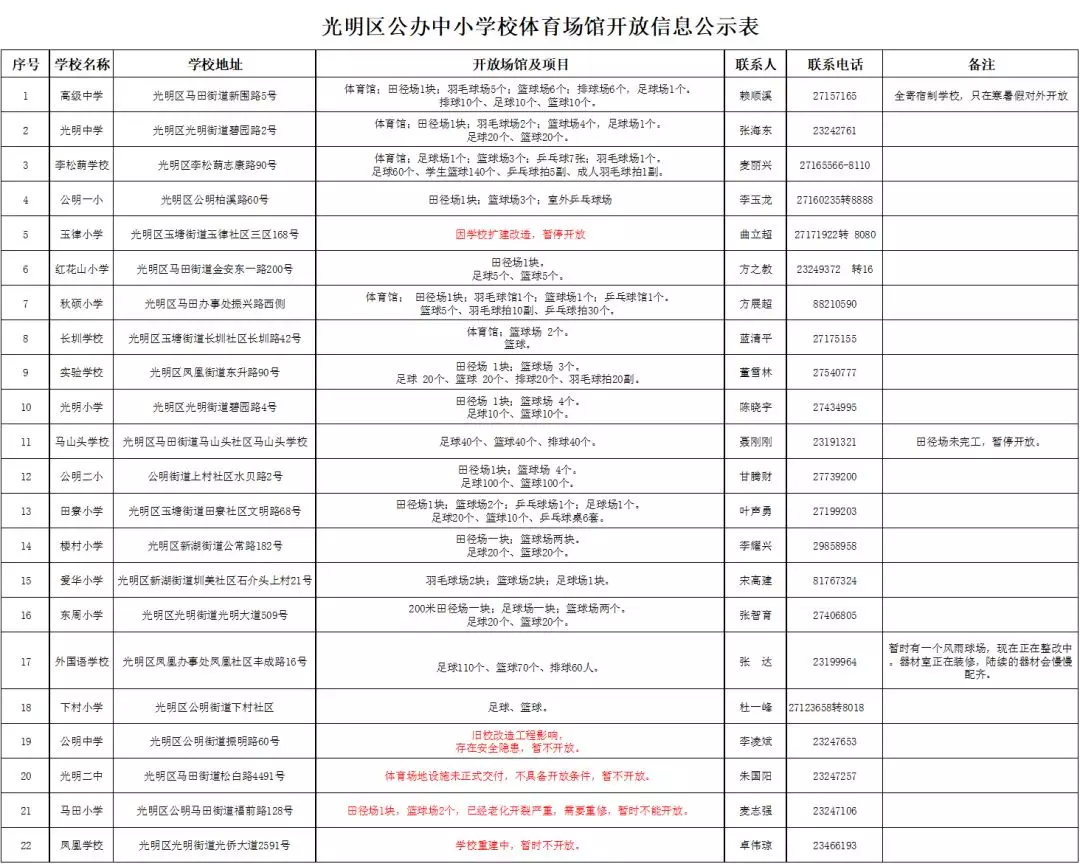 注意:光明區(qū)高級(jí)中學(xué)、光明中學(xué)是全寄宿制學(xué)校,學(xué)校體育場(chǎng)館設(shè)施只在寒暑假對(duì)外開放
