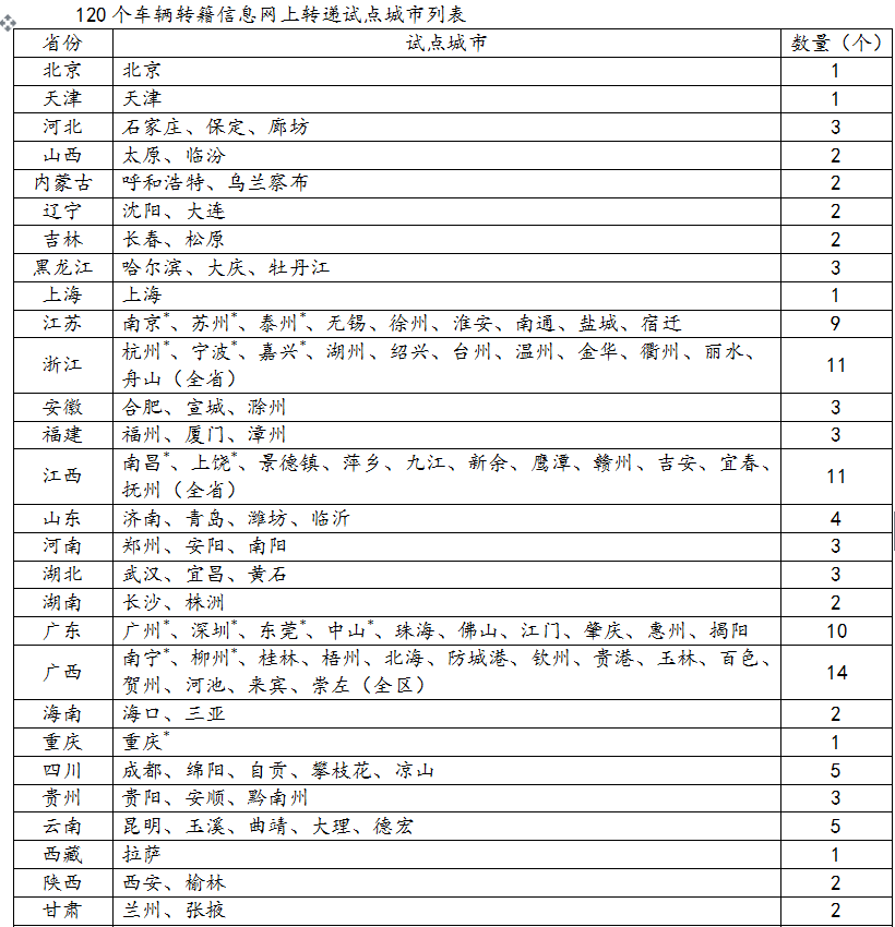 4.?dāng)U大車(chē)輛轉(zhuǎn)籍信息網(wǎng)上轉(zhuǎn)遞試點(diǎn)。在原有15個(gè)試點(diǎn)城市的基礎(chǔ)上,進(jìn)一步擴(kuò)大非營(yíng)運(yùn)小微型載客汽車(chē)檔案電子化網(wǎng)上轉(zhuǎn)遞試點(diǎn),在直轄市、省會(huì)市、自治區(qū)首府市、計(jì)劃單列市全部推行,同時(shí)各?。▍^(qū))至少再選擇1至2個(gè)城市推行。對(duì)機(jī)動(dòng)車(chē)在試點(diǎn)城市之間轉(zhuǎn)籍的,申請(qǐng)人可以直接到車(chē)輛遷入地車(chē)輛管理所申請(qǐng)并辦理,無(wú)需再回遷出地驗(yàn)車(chē)、提取紙質(zhì)檔案。