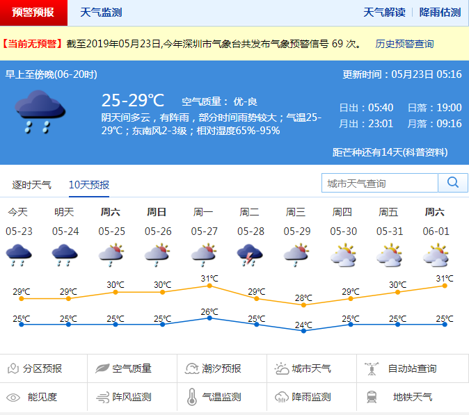 21日夜間至22日白天,寶安、光明和南山出現(xiàn)大雨,其他地區(qū)出現(xiàn)小雨。預(yù)計(jì)今明兩日我市陰天到多云,有中到大雨,局部暴雨;25-27日多云為主,有短時(shí)陣雨或雷陣雨;28日有雷陣雨;29日多云有短時(shí)陣雨。