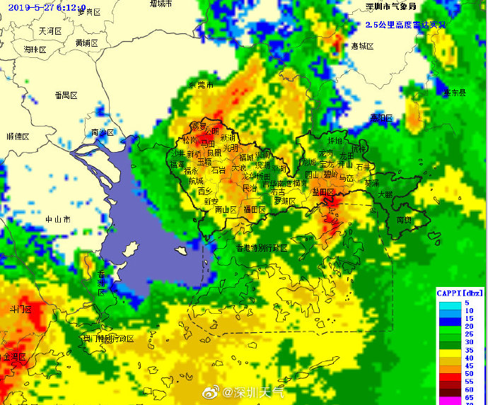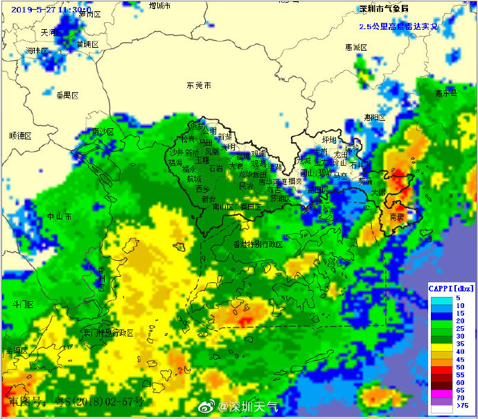 深圳市氣象臺(tái)于2019年05月27日09時(shí)15分將暴雨紅色和暴雨橙色分區(qū)預(yù)警降級(jí)為暴雨黃色預(yù)警,預(yù)計(jì)今天白天我市仍有雷雨,部分時(shí)間雨勢(shì)較大,全市暴雨黃色和雷電預(yù)警生效中,請(qǐng)繼續(xù)做好防御。