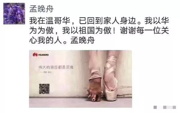 當(dāng)?shù)貢r間2018年12月1日,加拿大當(dāng)局應(yīng)美方要求,扣留了在加拿大機場轉(zhuǎn)機的孟晚舟,美國隨后承認,正在尋求對孟晚舟的引渡。10天之后,2018年12月11日,加拿大法院作出裁決,批準孟晚舟的保釋申請。當(dāng)晚,走出法庭的孟晚舟發(fā)朋友圈表示,我以華為為傲,我以祖國為傲。配圖就是那張“芭蕾腳”的華為廣告圖,上面寫著:偉大的背后都是苦難。外界擔(dān)心,由于不斷升級的中美貿(mào)易摩擦,可能會影響到孟晚舟在加拿大的引渡訴訟。