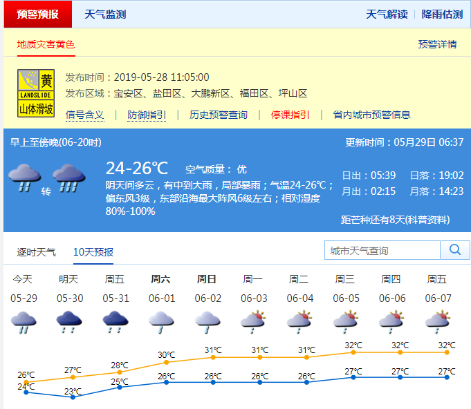 據(jù)氣象預(yù)報(bào),29日白天有中到大雨,局部暴雨;30日有雷陣雨,局部大雨。;31日-6月1日有陣雨,部分時(shí)間雨勢(shì)稍大。需重點(diǎn)防御持續(xù)強(qiáng)降水引發(fā)的地質(zhì)災(zāi)害、城市積澇等次生災(zāi)害。