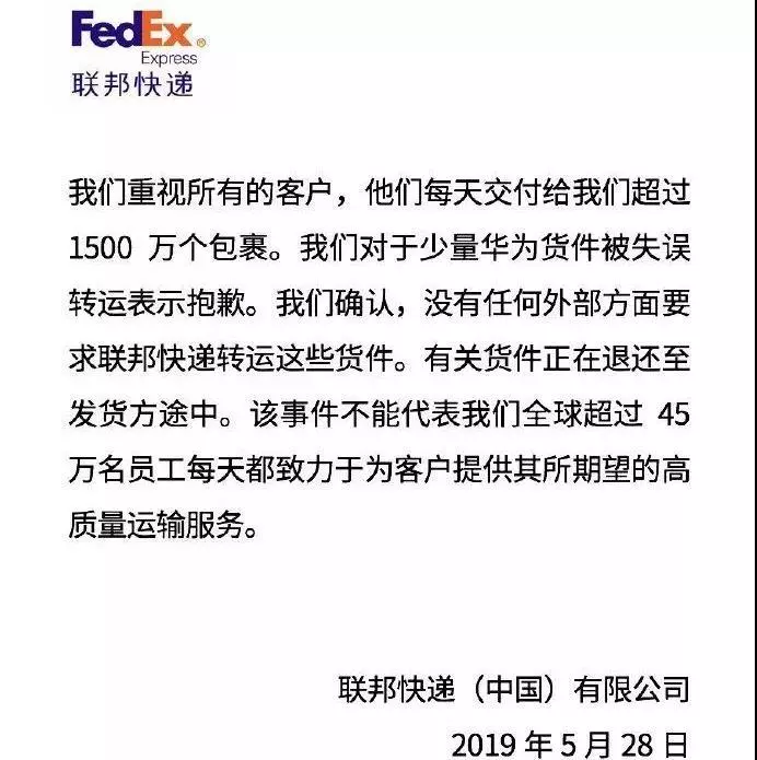 聯(lián)邦快遞(中國)公司28日在其社交媒體官方賬號稱,“我們對于少量華為貨件被失誤轉(zhuǎn)運(yùn)表示抱歉。我們確認(rèn),沒有任何外部方面要求聯(lián)邦快遞轉(zhuǎn)運(yùn)這些貨件。有關(guān)貨件正在退還至發(fā)貨方途中?!?/p>
