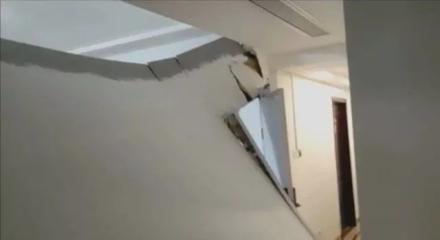 馬先生提供的現(xiàn)場視頻顯示,坍塌的墻體有5米多長,已經(jīng)整體歪向了一邊,壓住了房間的衣柜,也把房門壓得變形。