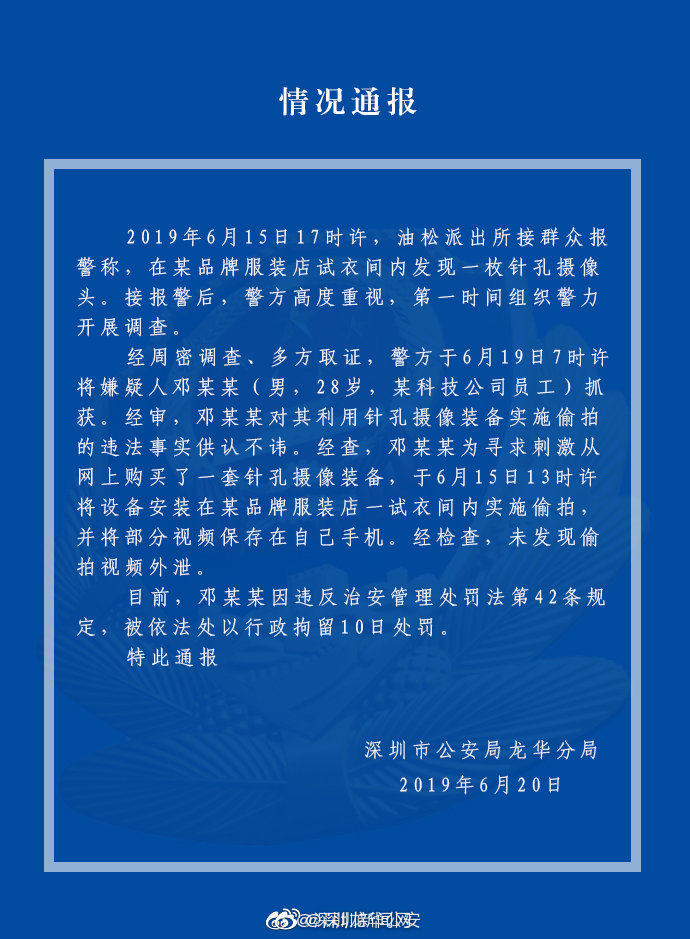 6月19日,深圳市一家優(yōu)衣庫(kù)門店暗藏針孔攝像頭一事有了最新進(jìn)展。龍華警方表示,嫌疑人鄧某某(男,28歲)已被抓獲,其為某科技公司員工,為求刺激安裝,目前被依法處以行拘10日處罰,未發(fā)現(xiàn)視頻外泄。多地多起偷拍事件頻發(fā),證明這不是孤立的個(gè)案。想管住日漸泛濫的針孔攝像頭,不能僅靠公眾每次住宿時(shí)的“偵探式”自救和“地毯式”搜查,諸多應(yīng)對(duì)的方法也難逃人性與欲望的丑惡。涉事的優(yōu)衣庫(kù)門店在事發(fā)時(shí)曾表示,檢查試衣間只檢查是否有顧客遺留物品,而此前某涉事酒店負(fù)責(zé)人以攝像頭安裝隱蔽、工作人員難以發(fā)現(xiàn)、不專業(yè)為由,回避問(wèn)題。店家事后的說(shuō)辭讓人心生涼意,大事化小、小事化了的補(bǔ)救措施也不能消除消費(fèi)者心中的恐懼,作為管理方尚且如此態(tài)度,作為弱勢(shì)群體的消費(fèi)者,還需要多少案例才能換來(lái)隱私的保障?