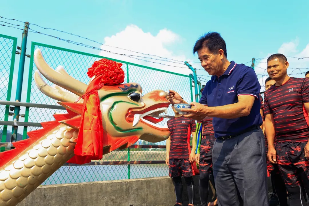 每年龍舟賽在下水訓(xùn)練前,村中會定好日子,然后選一位年紀(jì)大且威望高的老人作代表,在祠堂為龍船點睛。