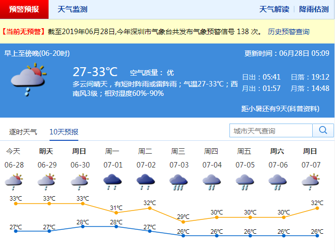深圳新聞網(wǎng)2019年6月28日訊 市氣象局預(yù)計(jì)28日多云間晴天,有短時(雷)陣雨,局部地區(qū)雨勢較大,降雨易出現(xiàn)在早晨和午后時段;氣溫27-33℃,天氣炎熱;西南風(fēng)緩和,沿海和高地最大陣風(fēng)可達(dá)6-7級;相對濕度60%-90%,雨后濕度增大,體感悶熱。29-30日與28日天氣較為相似,天氣炎熱,有短時(雷)陣雨,局部地區(qū)雨勢較大;展望7月1-2日陣雨增多。