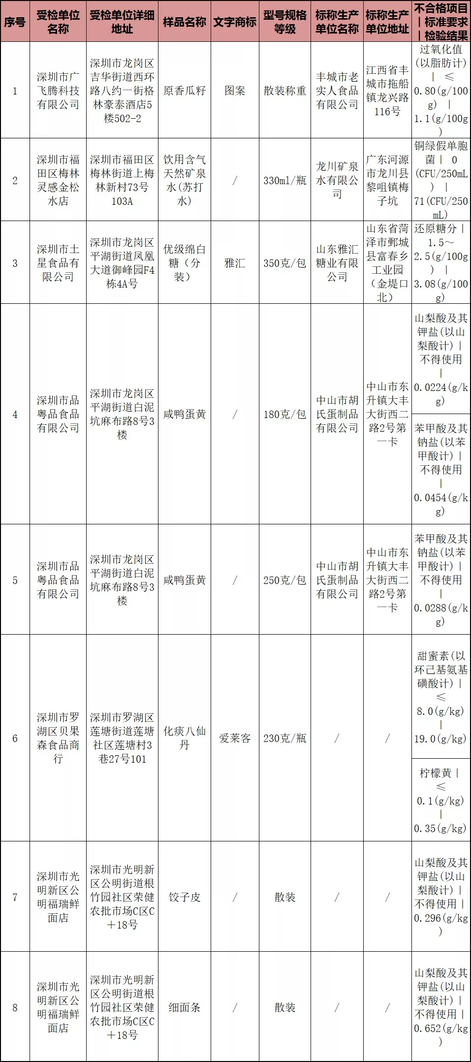 本次共抽檢生產(chǎn)、流通、餐飲環(huán)節(jié)食品619批次,涉及生產(chǎn)、流通、餐飲環(huán)節(jié)經(jīng)營主體275家次,共檢測食品指標(biāo)3614項(xiàng)次。其中檢出不合格樣品8批次,涉及不合格食品類別有炒貨食品及堅(jiān)果制品1批次,蛋制品2批次,糧食加工品2批次,食糖1批次,水果制品1批次,飲料1批次;涉及不合格項(xiàng)目類別為微生物污染、食品添加劑、品質(zhì)指標(biāo)。