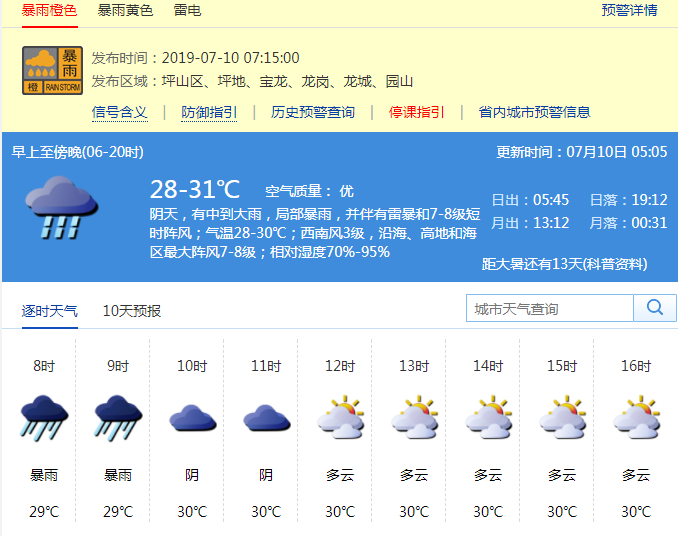 深圳新聞網(wǎng)2019年7月10日訊 7月10日早晨6時(shí)50分從深圳市氣象臺獲悉,過去1小時(shí),龍崗區(qū)(寶龍、龍崗、龍城、園山街道、坪地街道)和坪山區(qū)累計(jì)雨量已達(dá)暴雨,預(yù)計(jì)強(qiáng)降雨還將持續(xù)1小時(shí)左右,深圳市氣象臺于7月10日6時(shí)45分在龍崗區(qū)(寶龍、龍崗、龍城、園山街道)發(fā)布暴雨橙色分區(qū)預(yù)警,7時(shí)15分又在坪山區(qū)和龍崗區(qū)坪地街道發(fā)布暴雨橙色分區(qū)預(yù)警。全市進(jìn)入暴雨防御狀態(tài),請注意防御。全市中小學(xué)、幼兒園可視情況推遲上學(xué)。