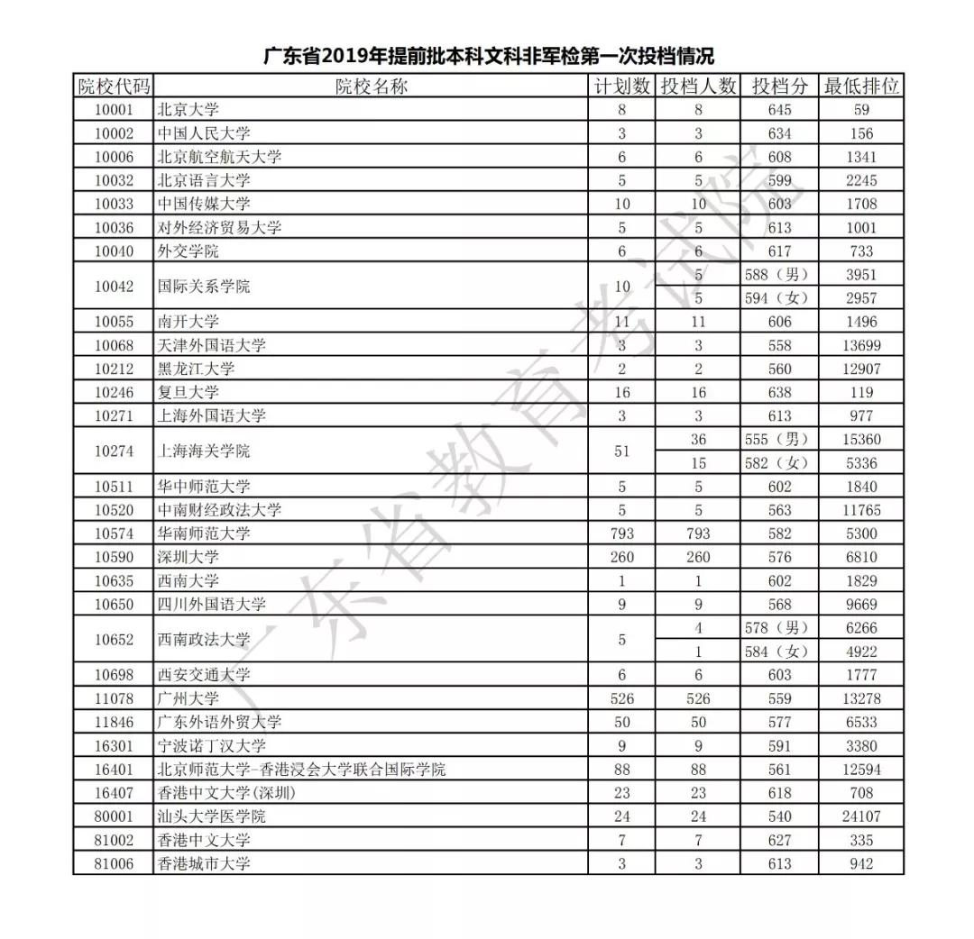 廣東省2019年提前批本科非軍檢第一次投檔情況公布