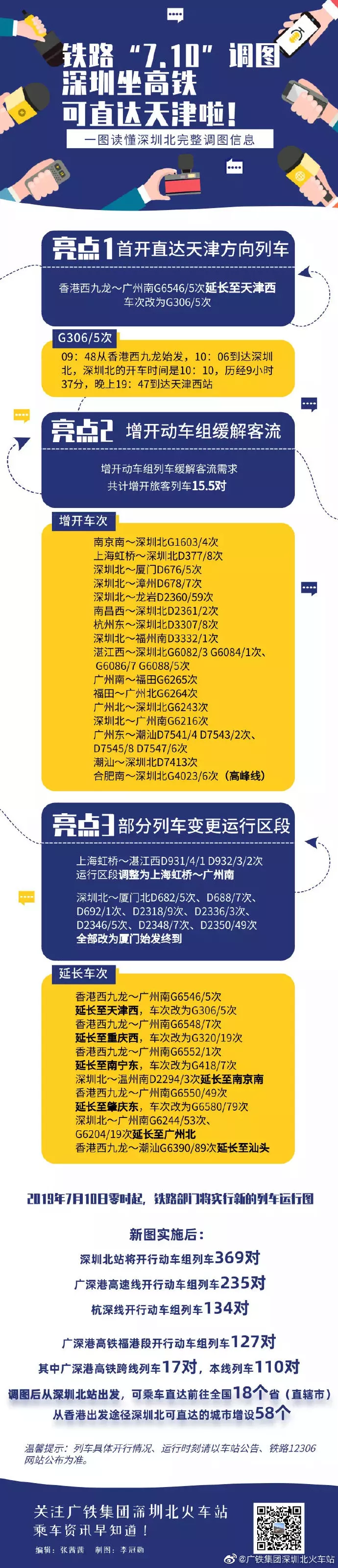 根據(jù)新的運(yùn)行圖安排,深圳北站將開行動車組列車369對,廣深港高速線開行動車組列車235對;杭深線開行動車組列車134對?!?·10”調(diào)圖后,深圳北站首開前往天津方向列車,屆時從深圳北站出發(fā),可乘車直達(dá)前往全國18個?。ㄖ陛犑校?;從香港出發(fā)途徑深圳北可直達(dá)的城市增設(shè)58個。